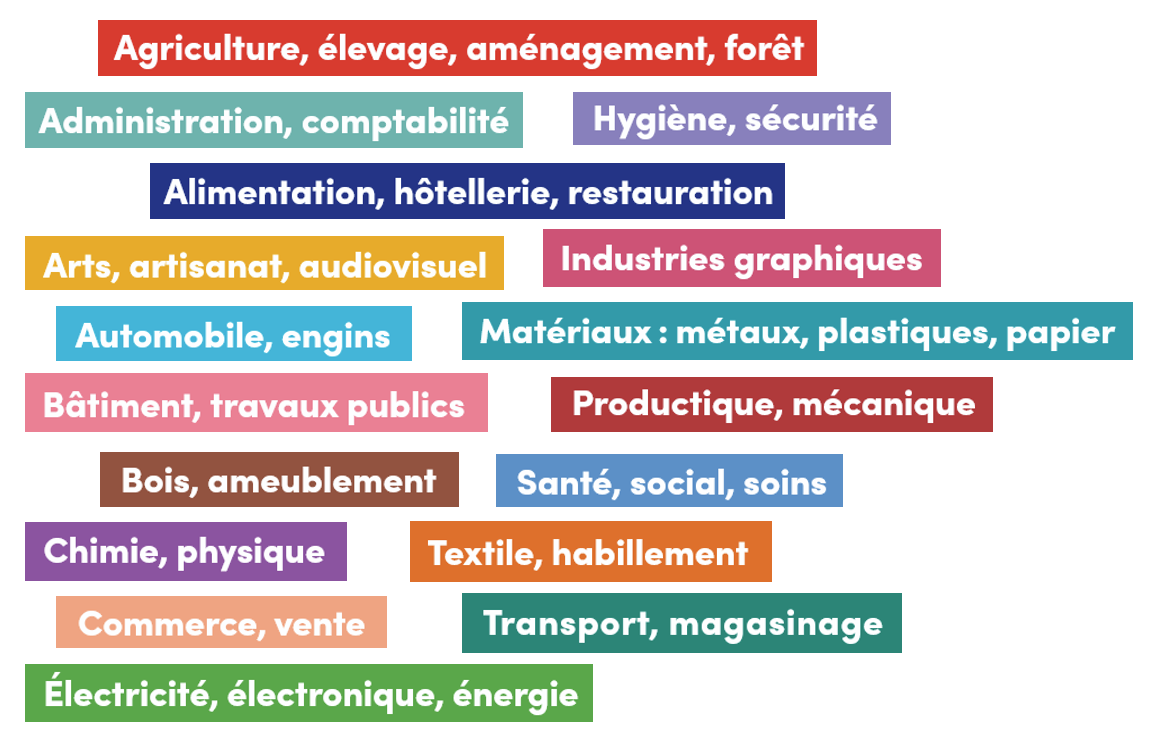 Si la voir pro désigne un parcours scolaire orienté vers la découverte d’un métier, quel que soit le domaine, et l’insertion rapide dans le monde du travail, elle permet aussi de poursuivre ses études. Dans ce guide vous trouverez les formations de la voie pro classées par 17 Grands domaines, reconnaissables par un code couleur !